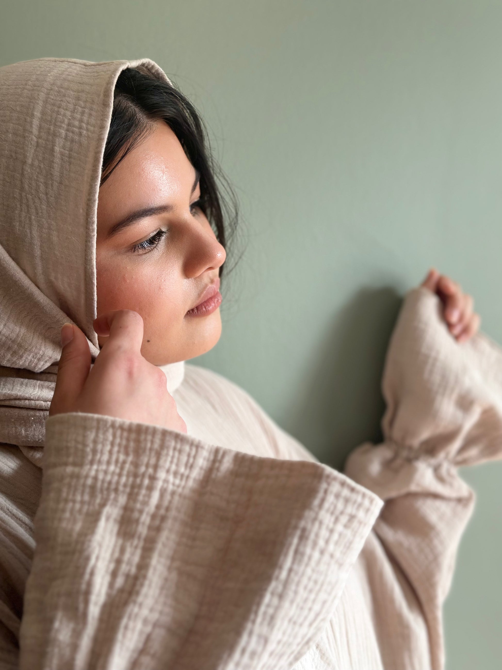 Tenue adaptée pour prier, recevoir ou rendre visite. La abaya Marhaba est adaptée à toutes les morphologies, elle est composé de son long et large foulard.